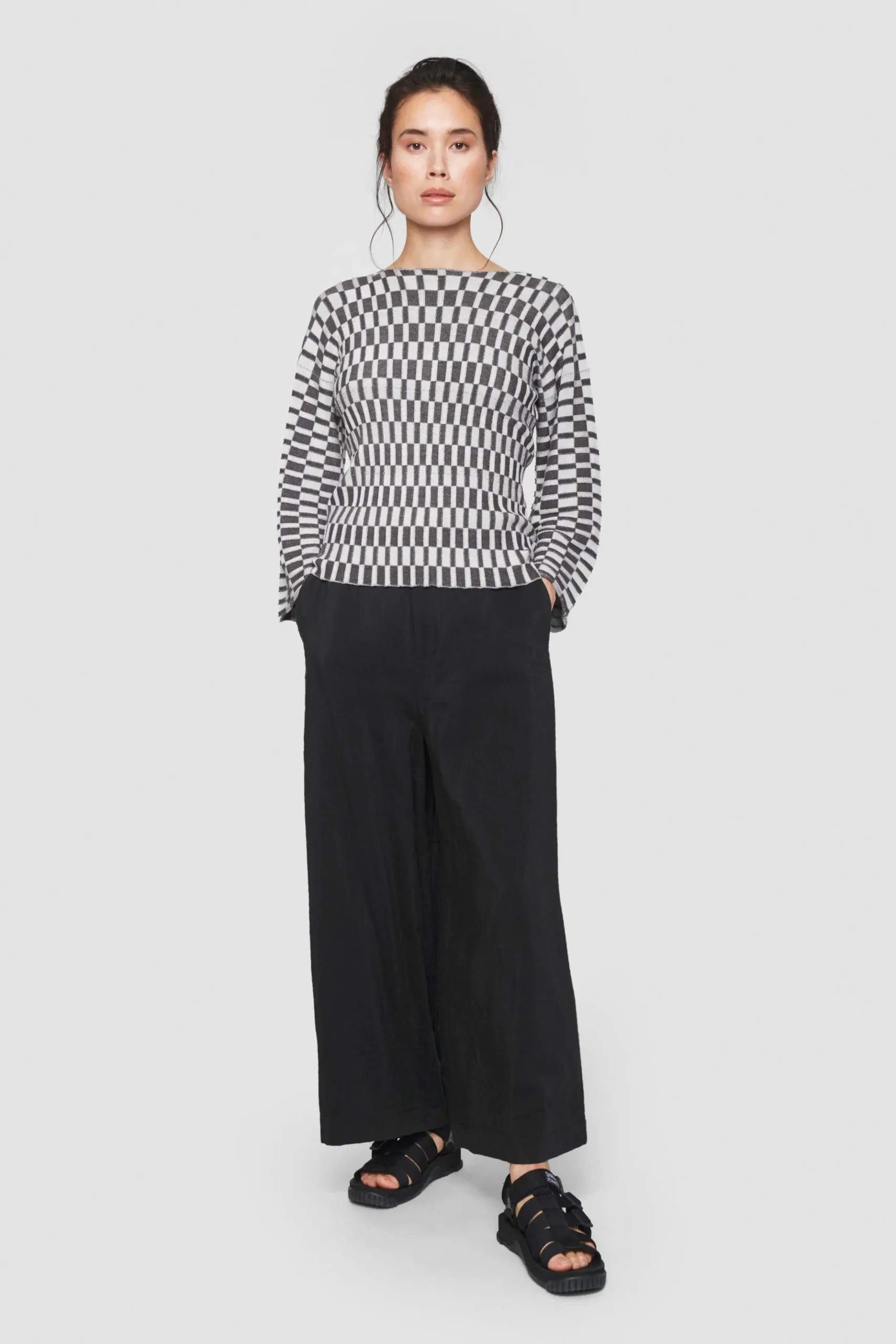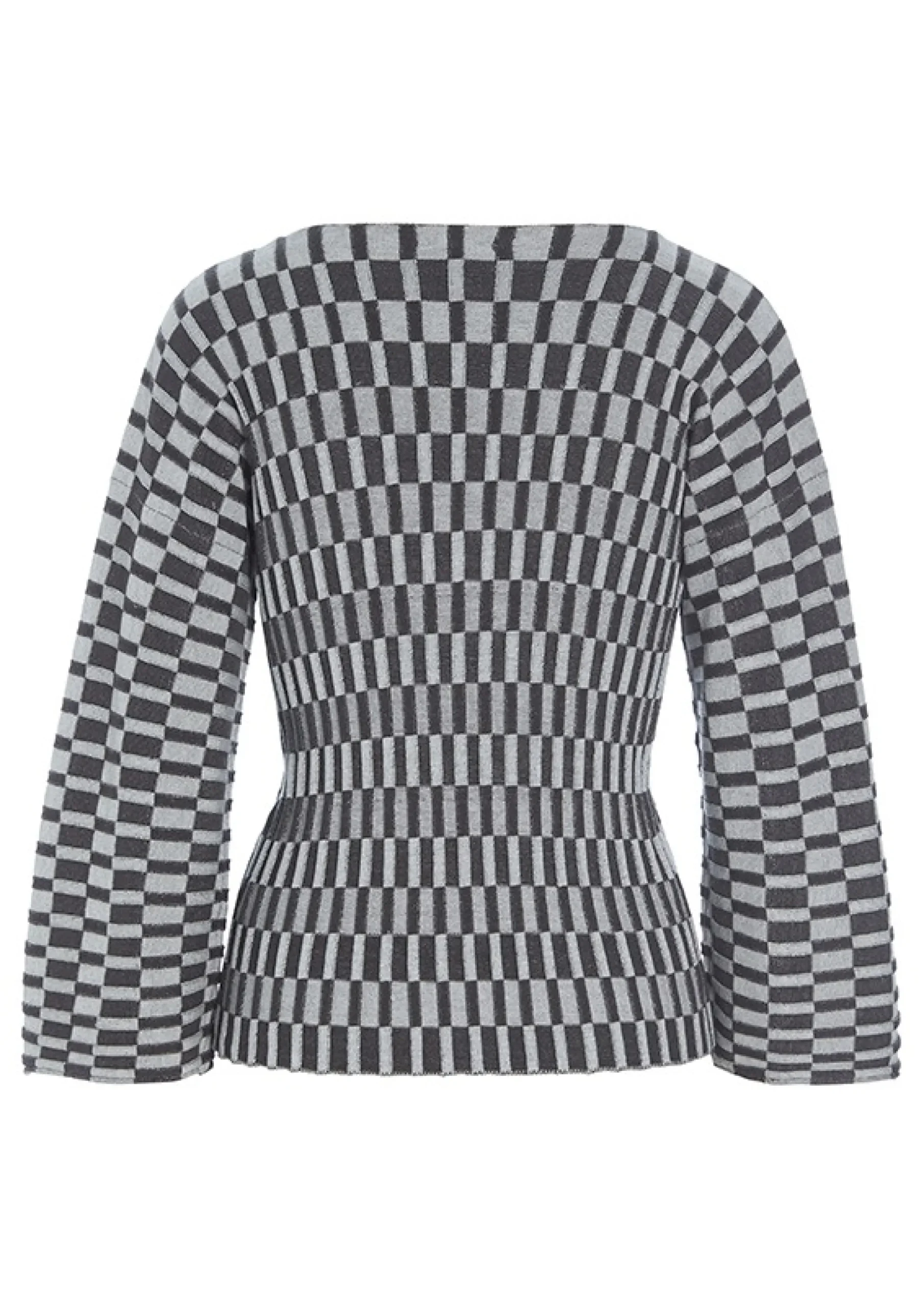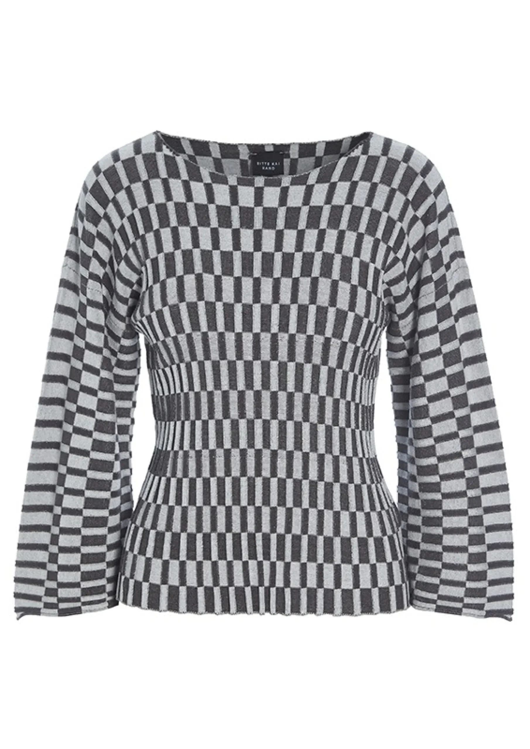 Strikbluse I Enkelt Snit Og Med Et Ternet Ribmonster, Der Fortsaetter Fra Krop Til Aerme, Som Var Blusen Strikket I Ut Stykke. Det Har En Naesten Skulpturel Virkning Og Giver En Smuk Effekt Pa Kroppen. Blusen Vil Opgradere Dine Jeans Og Gore Sig Flot Med Alle Bukser Og Shorts.