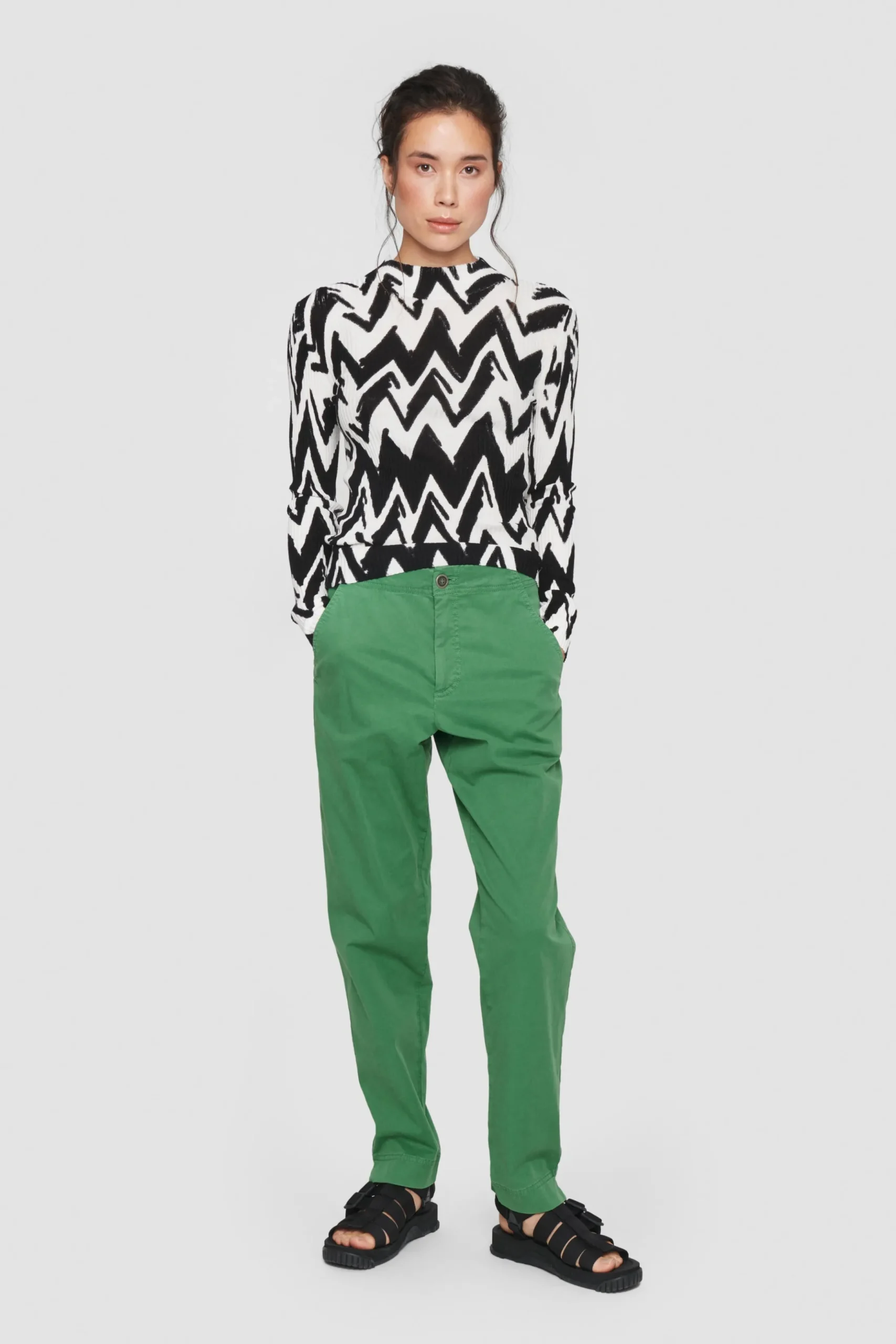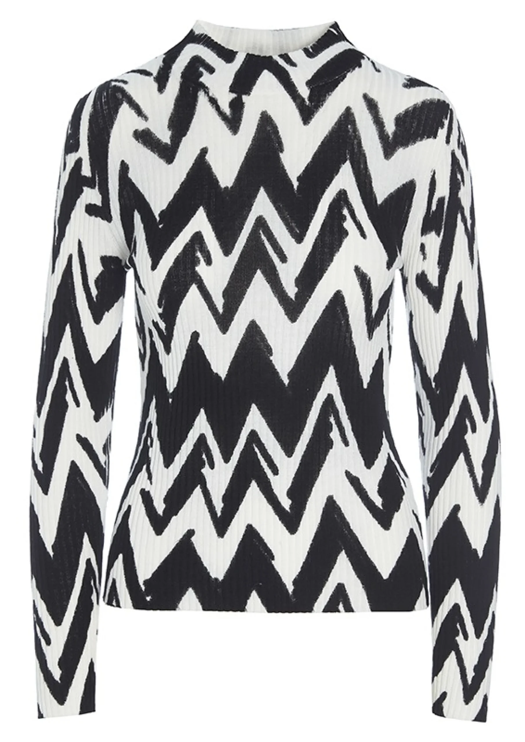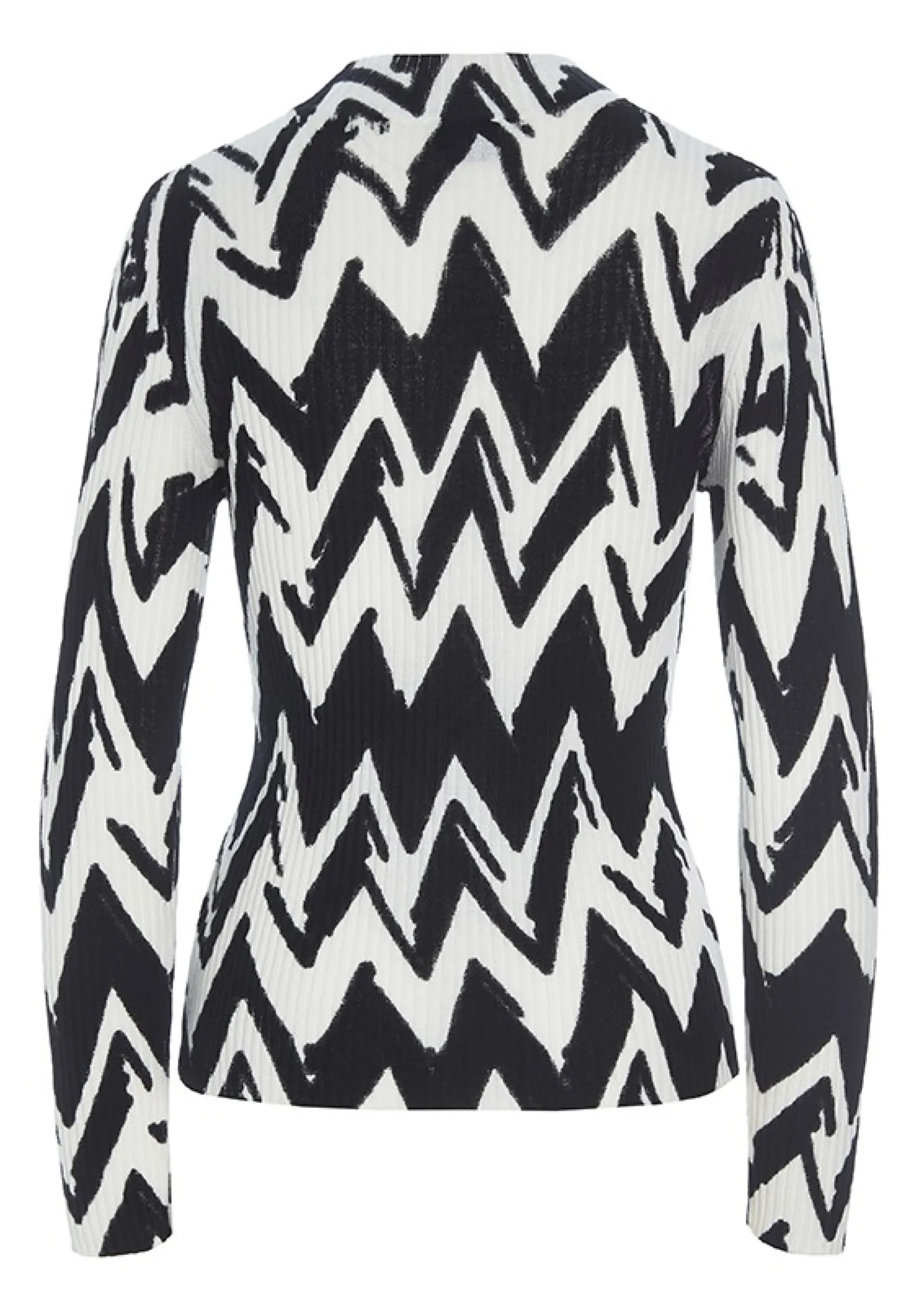 Strikbluse I Enkelt, Kropsnaert Snit Og Med Et Iojnefaldende Print, Som Bolger Henover Kroppen. Det Skaber En Grafisk Effekt, Der Fungerer Flot Som Blikfang I Et Monokromt Look. Blusen Er Ogsa Effektfuld, Kombineret Med Farvestralende Underdel, Stromper Og Sko.