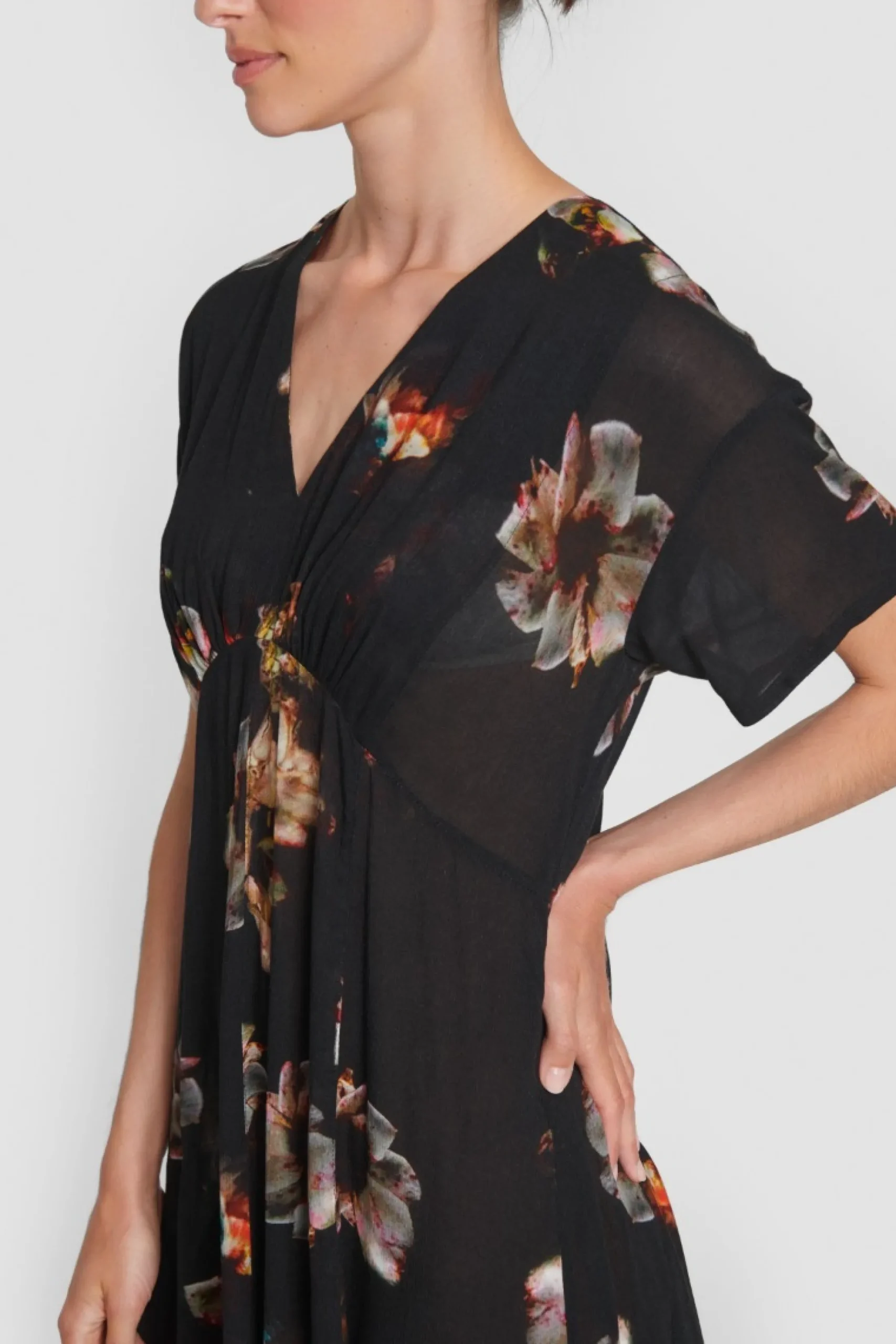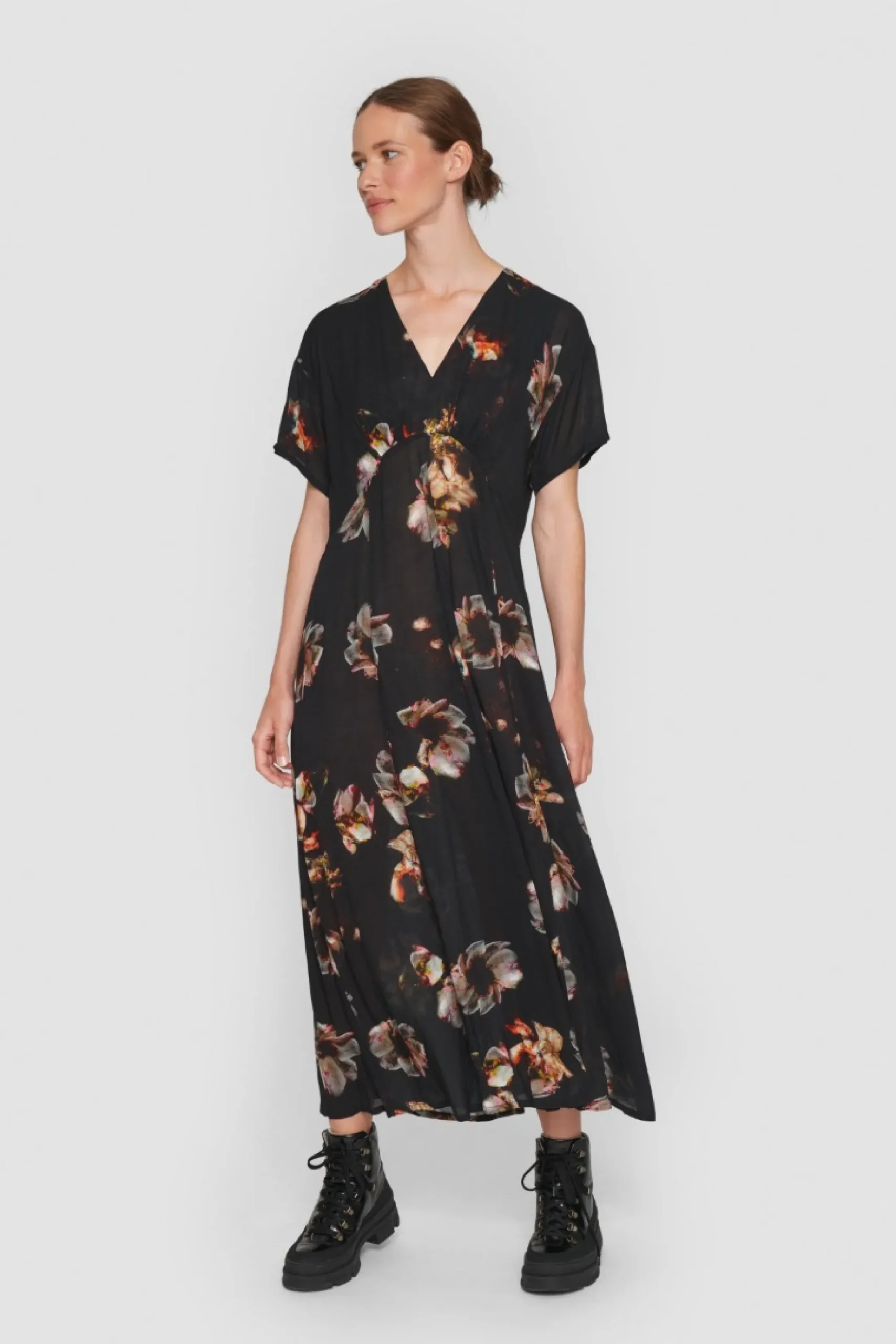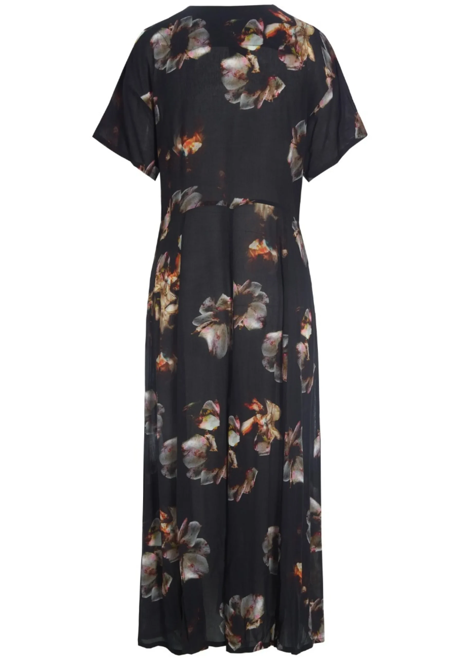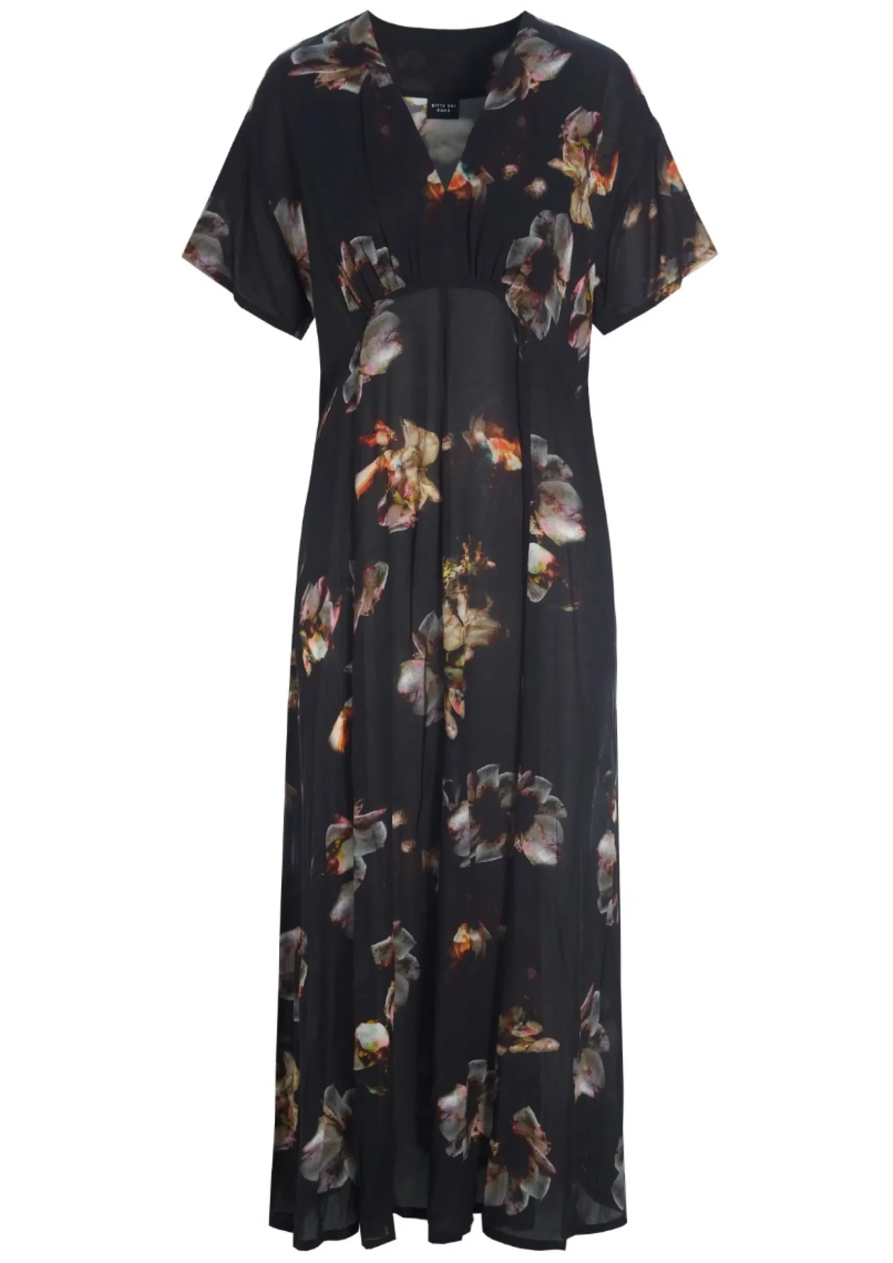 Kjole Med Abstrakt Blomsterprint I Fine Nuancer Og Et Helt Enkelt Og Klaedeligt Snit, Der Falder Flot Om Kroppen. En Kjole, Som Kan Bruges Til Hverdag Og Fest. Saet Ballerinaer Til, Der Rammer En Af Nuancerne I Monsteret, Eller Kombiner Med Herresko Og Flotte Oreringe.