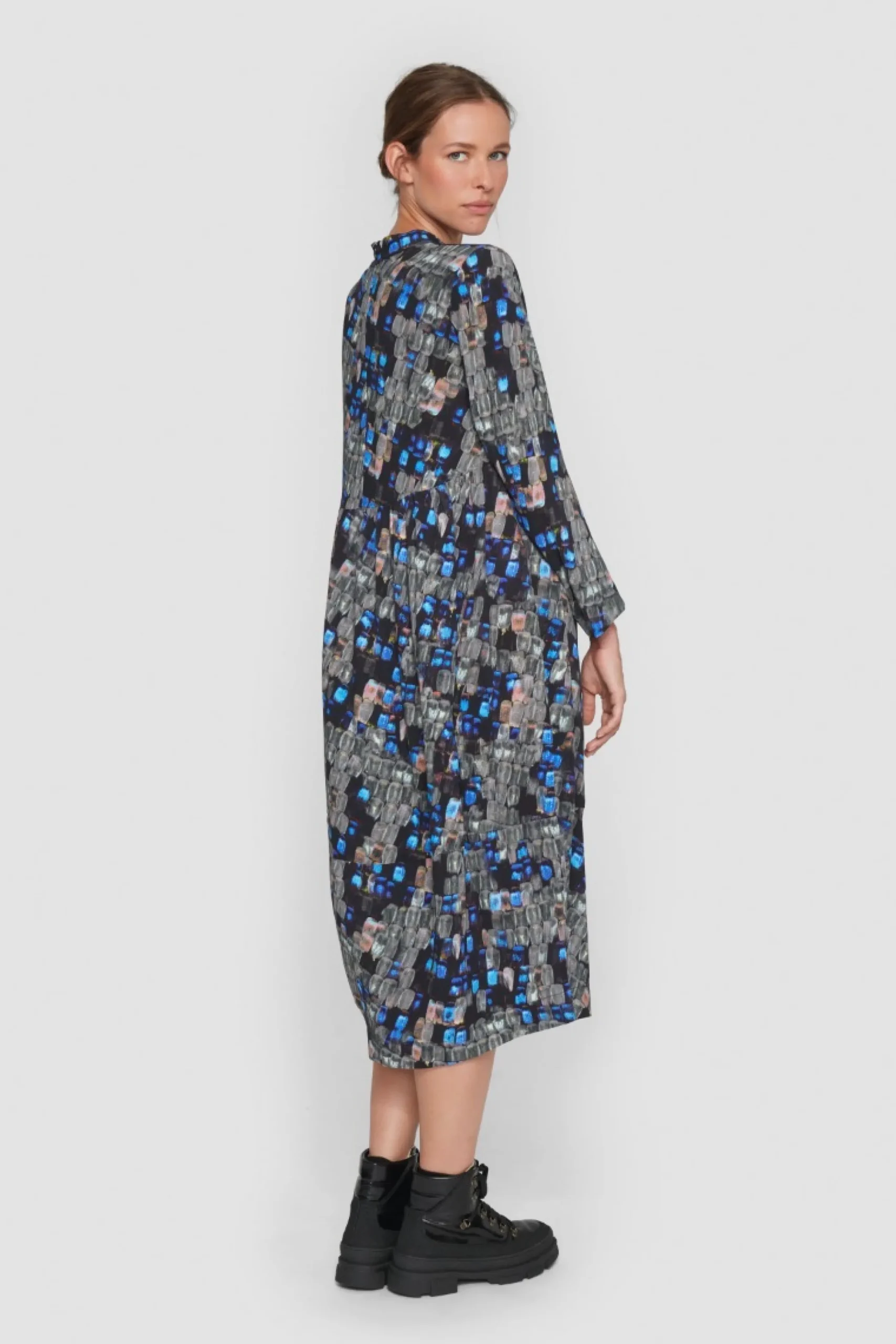 Kjole Med Voluminost Og Klaedeligt Snit, Der Falder Flot Om Kroppen. Det Farverige Og Naesten Magiske Print Vil Live Op Bade Til Hverdag Og Fest. Saet Ballerinaer Til, Der Rammer En Af Nuancerne I Monsteret, Eller Kombiner Med Sorte Herresko Og Flotte Oreringe.