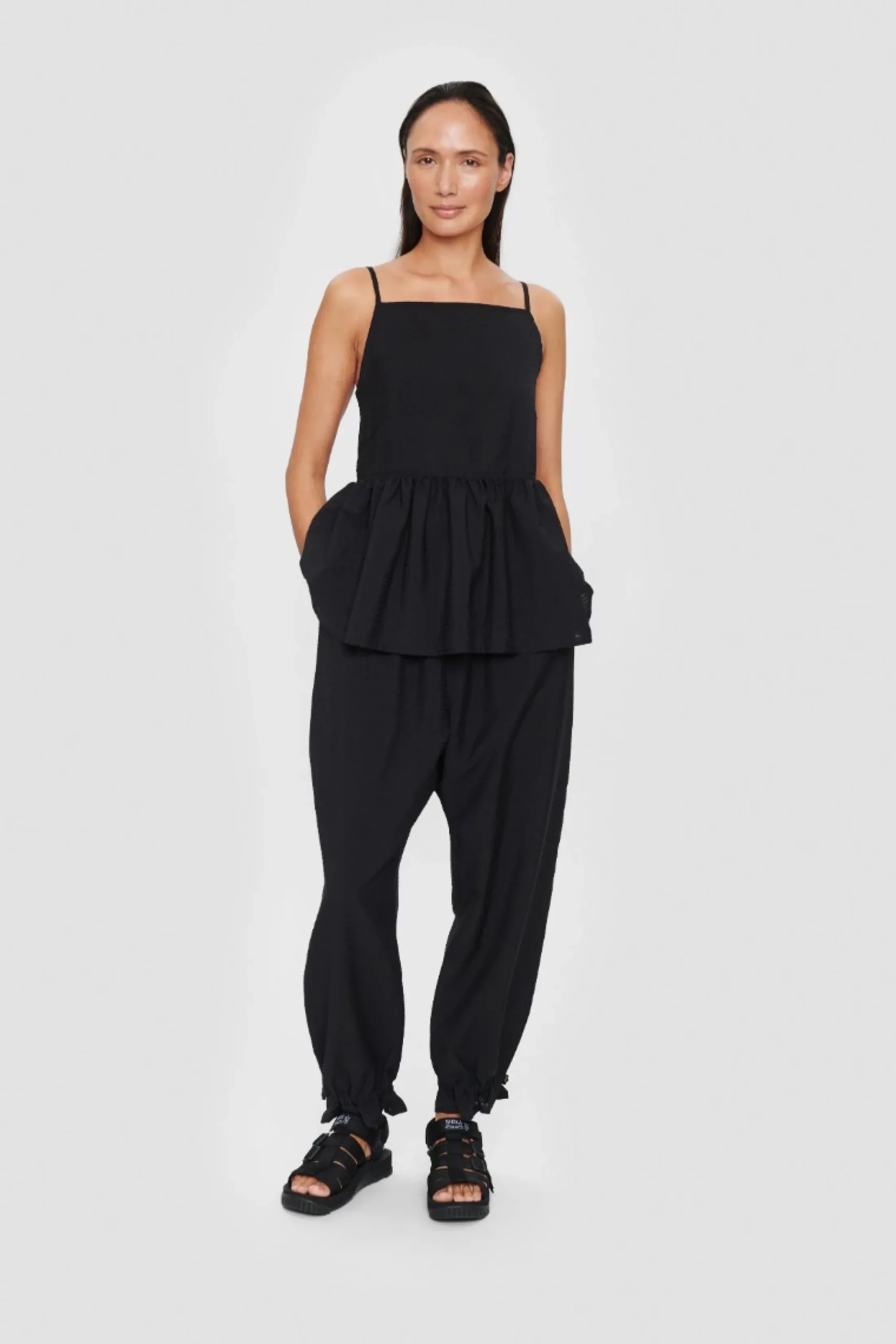 Bukser, Der Er Virkelig Behagelige At Have Pa Takket Vaere Den Lose Pasform. Buksebenene Har Rynkeeffekt Forneden, Hvilket Giver En Klaedelig Og Afslappet Facon. Bruger Du Bukserne Med Den Matchende Nami Seersucker Top, Far Du Et Tidlost Sommersaet.