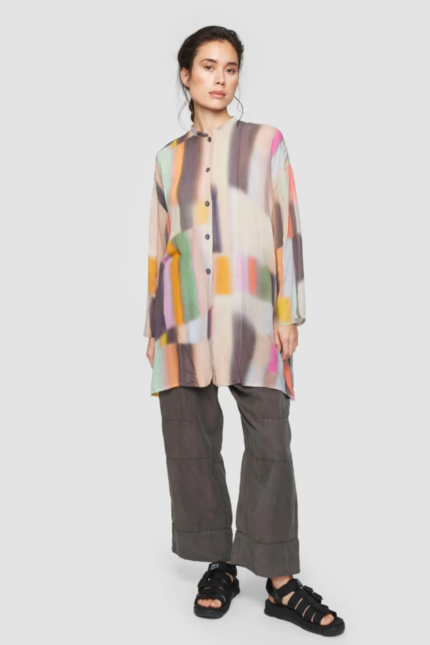 Lige Sa Enkel Denne Skjorte Er I Snittet, Lige Sa Iojnefaldende Er Dens Farverige Print, Der Gor Det Muligt At Matche Skjorten Med Sa Godt Som Alle Nuancer. Et Nogleelement I Garderoben, Der Kan Bruges Til Alt Fra Jeans Og Smalle Leggings Til Herrebukser Med Vidde.