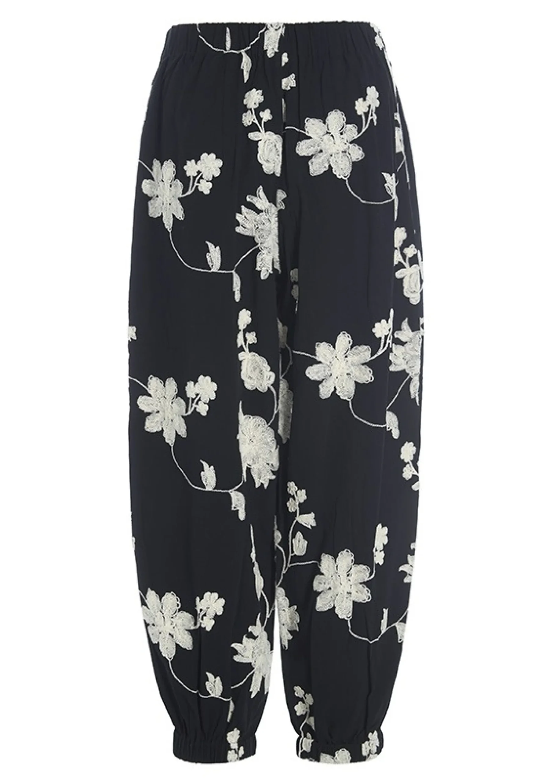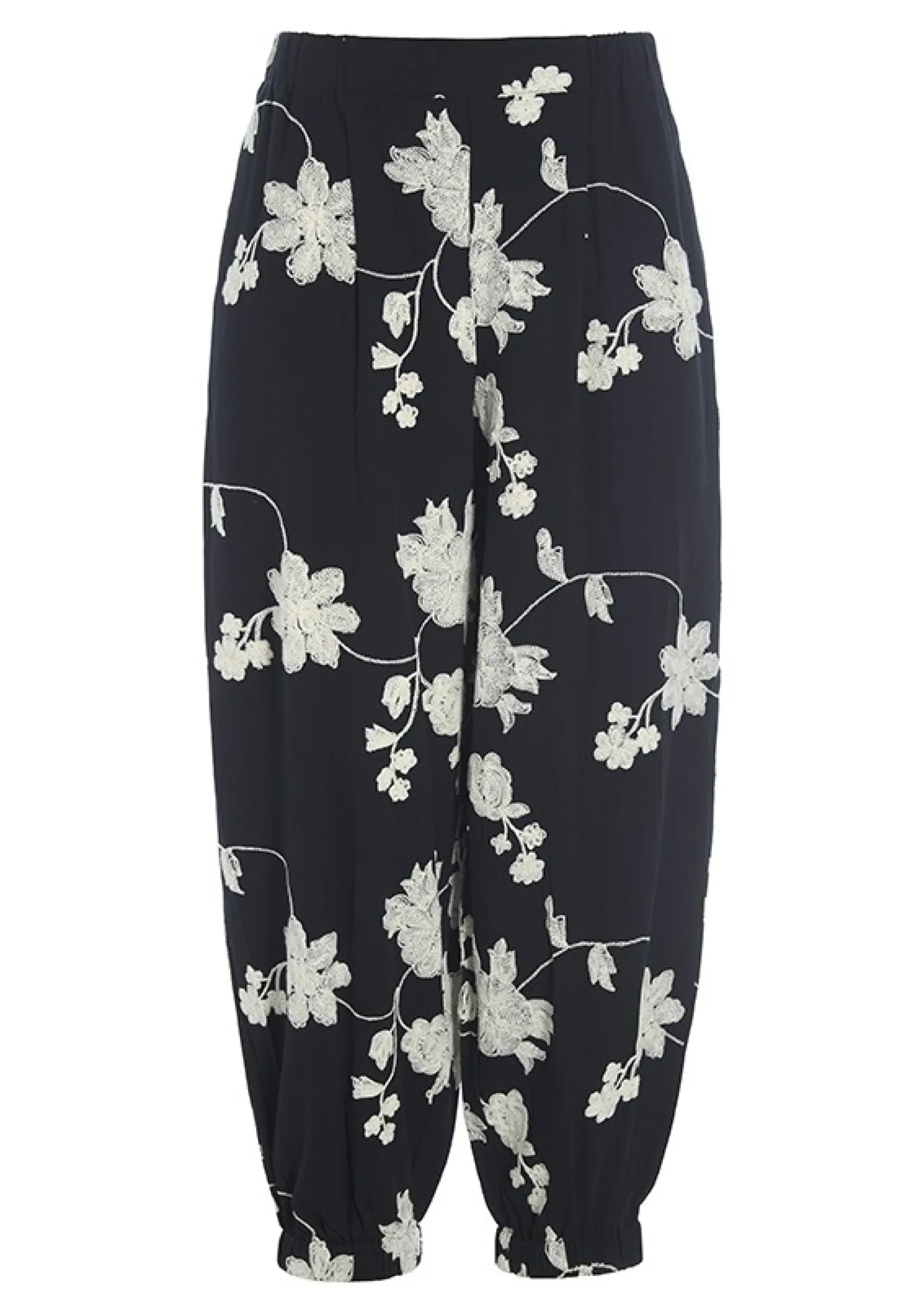 Det Kunstfaerdige Blomstermonster Giver Disse Lostsiddende Bukser Et Orientalsk Twist Og Gor Dem Oplagte At Bruge Med Bade Ensfarvede Og Monstrede Overdele. Du Kan Ogsa Skabe Et Flot Saet Ved At Saette Bukserne Til Den Matchende Embroidered Flower Jakke.