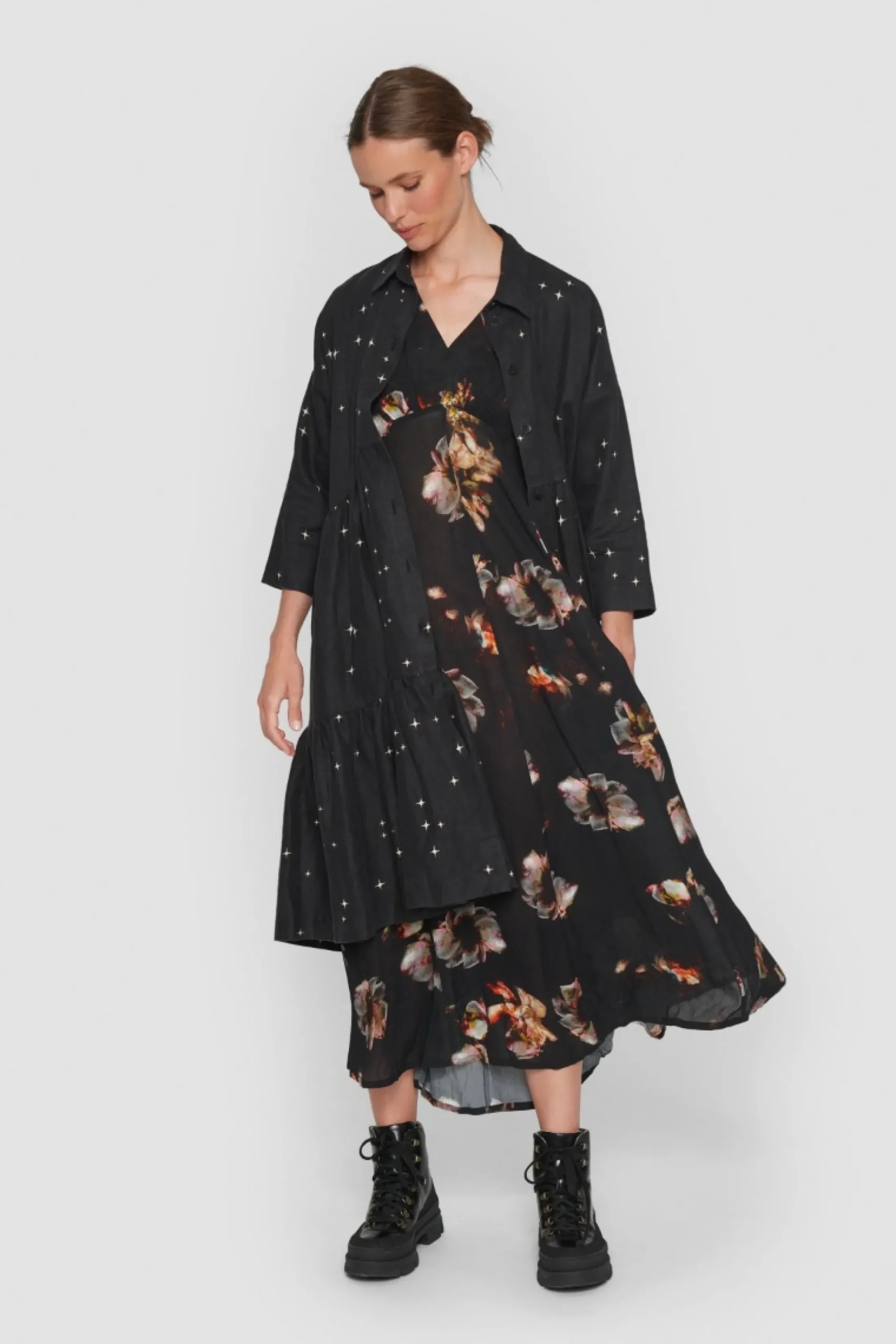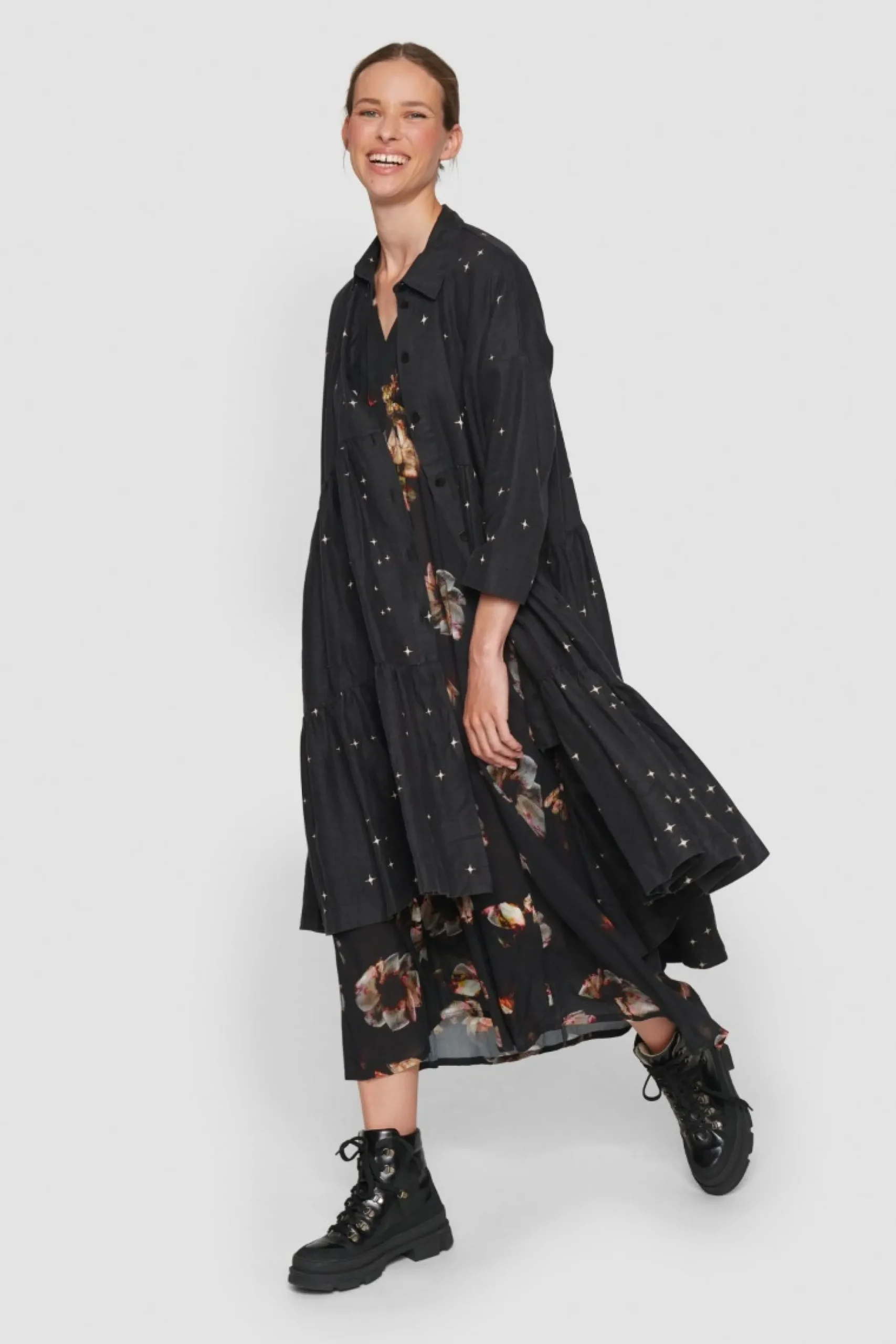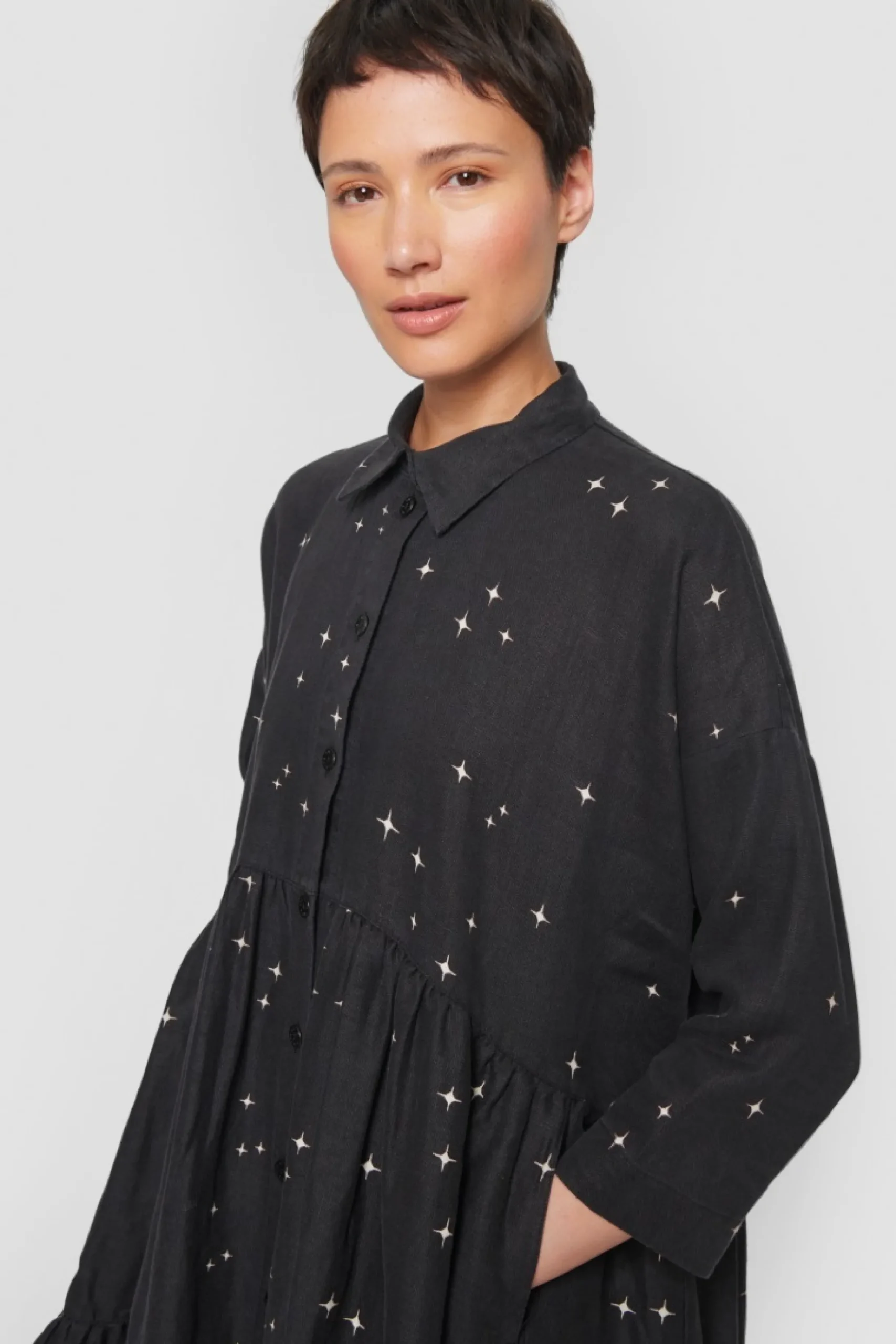Som En Magisk Nattehimmel Funkler De Sma Stjerner Pa Denne Fine Frakkekjole, Der Har Et Voluminost Udtryk Og Falder Smukt Om Kroppen. Med Denne Kjole Bliver Du Velklaedt I En Fart. Tilsaet Blot Stromper, Herresko Eller Sneakers, Og Du Er Klar Til Enhver Lejlighed.