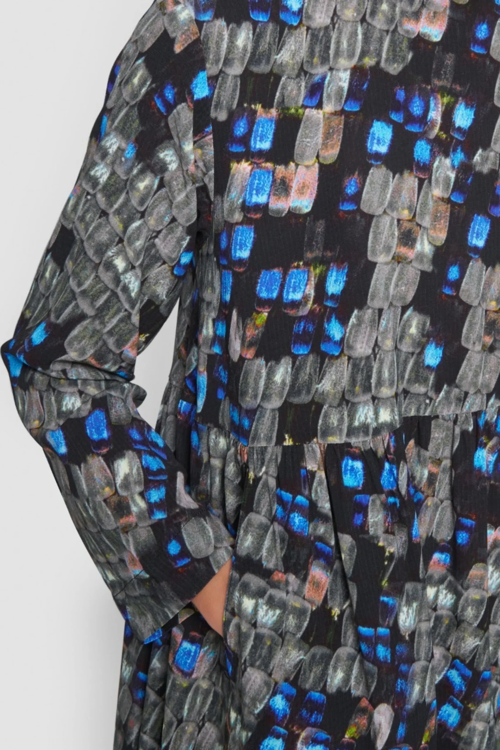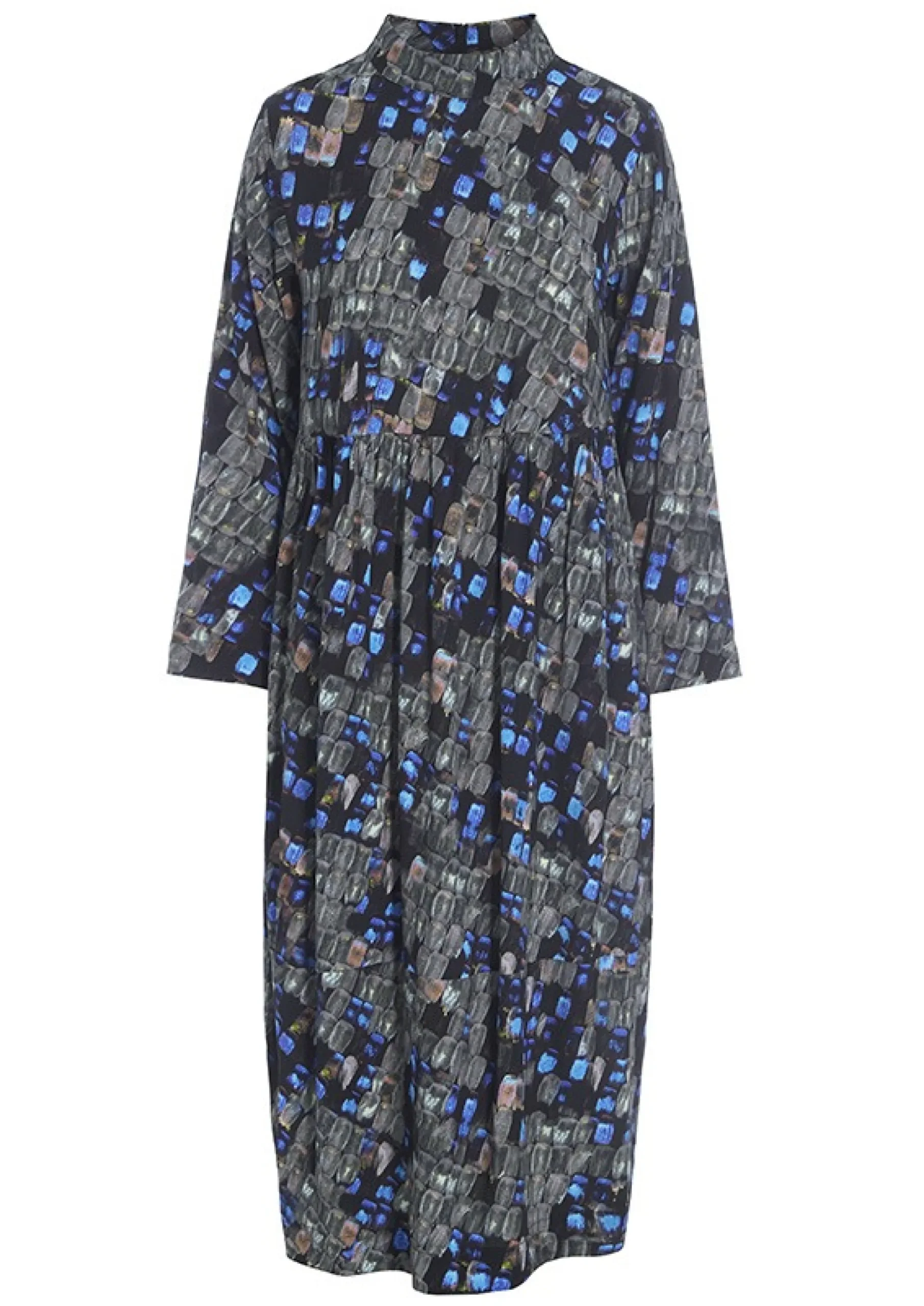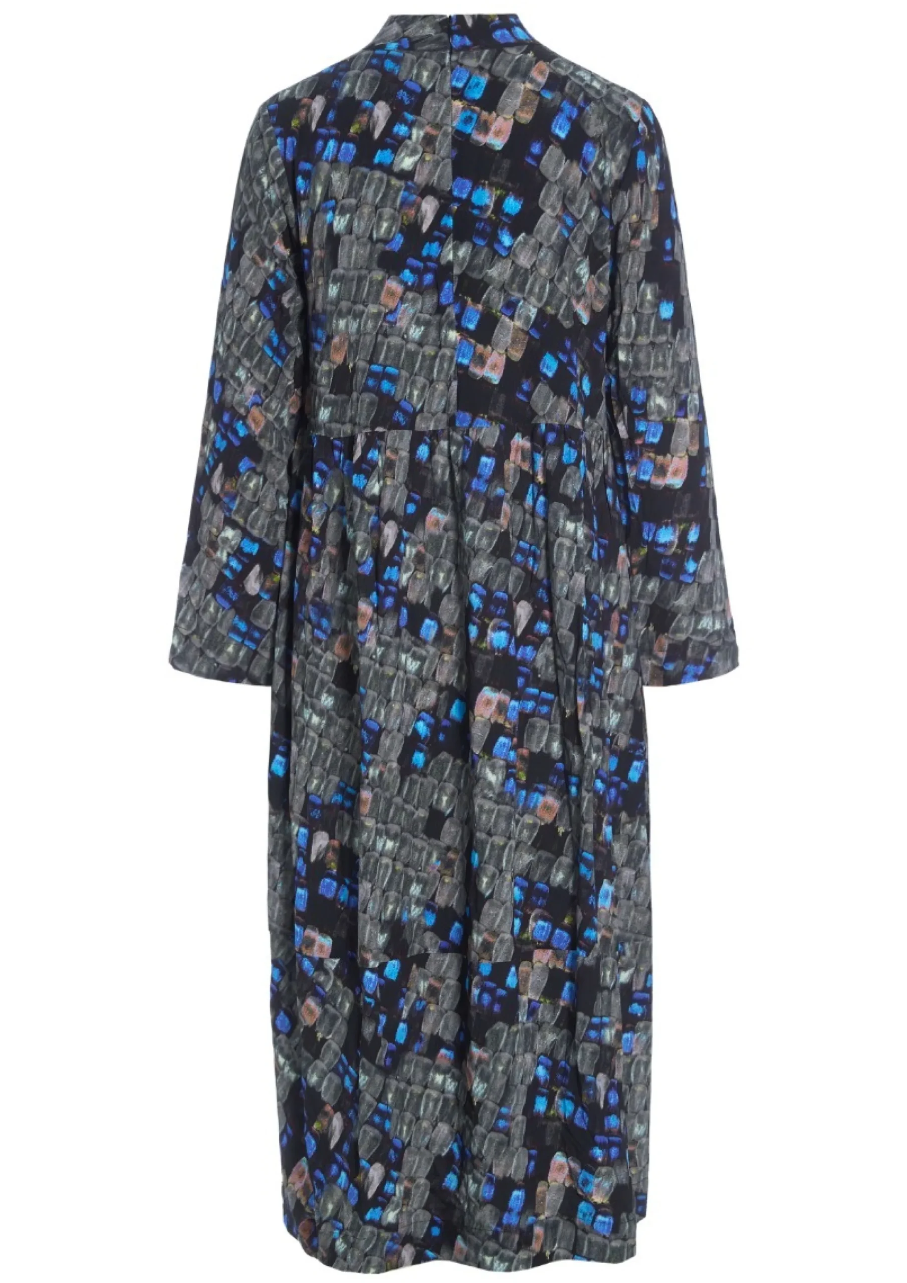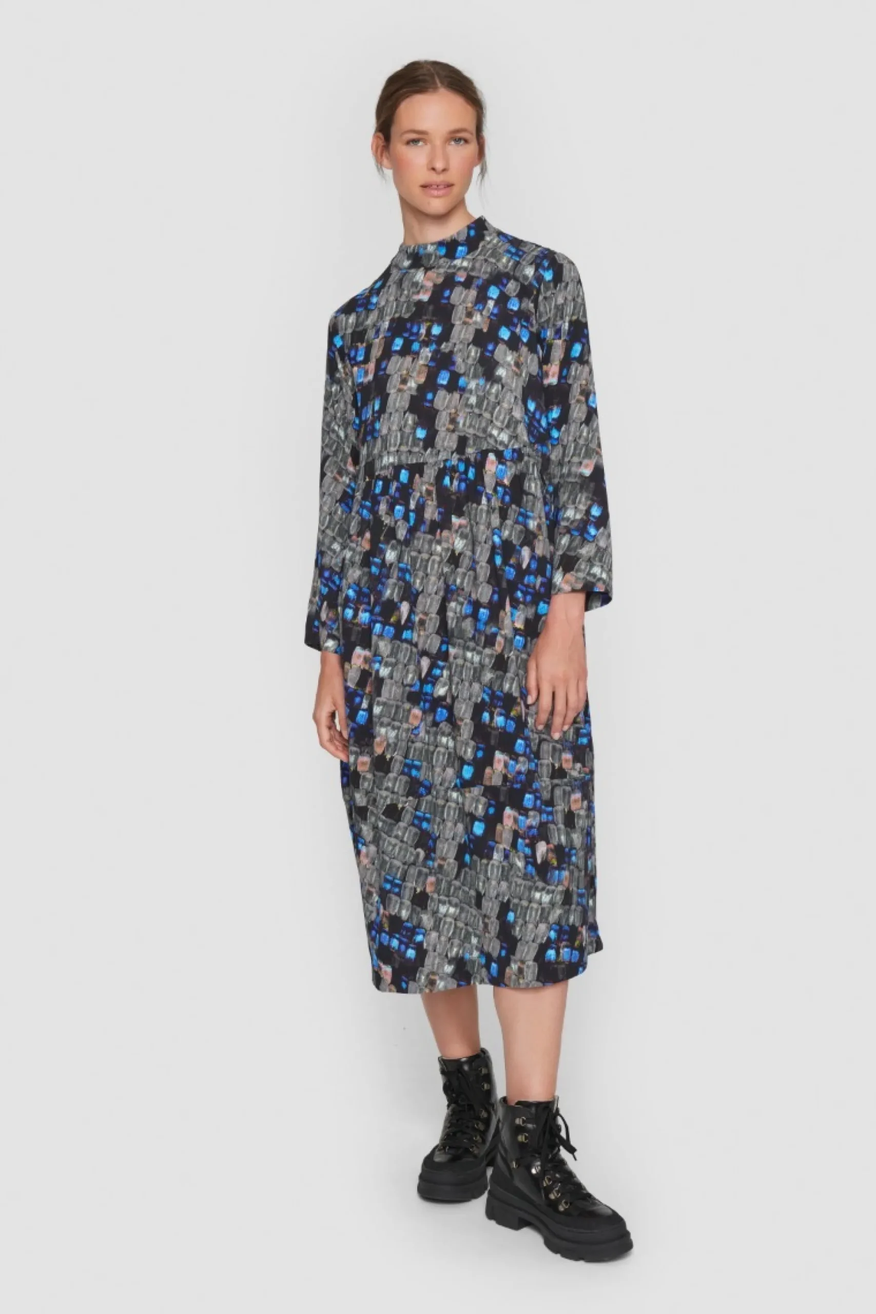 Kjole Med Voluminost Og Klaedeligt Snit, Der Falder Flot Om Kroppen. Det Farverige Og Naesten Magiske Print Vil Live Op Bade Til Hverdag Og Fest. Saet Ballerinaer Til, Der Rammer En Af Nuancerne I Monsteret, Eller Kombiner Med Sorte Herresko Og Flotte Oreringe.